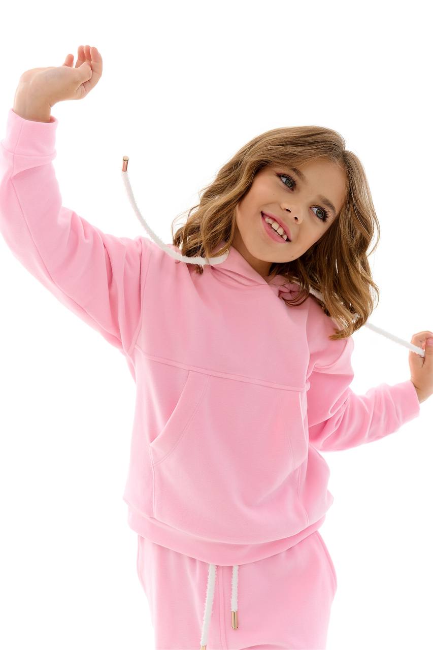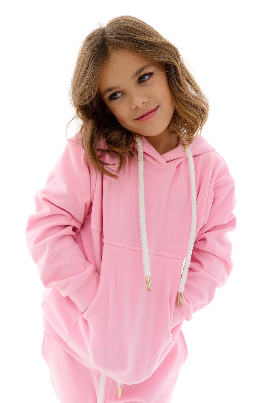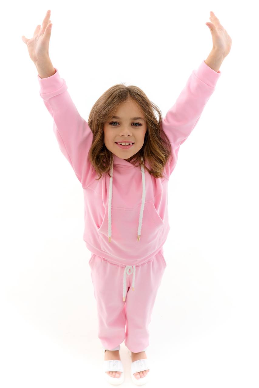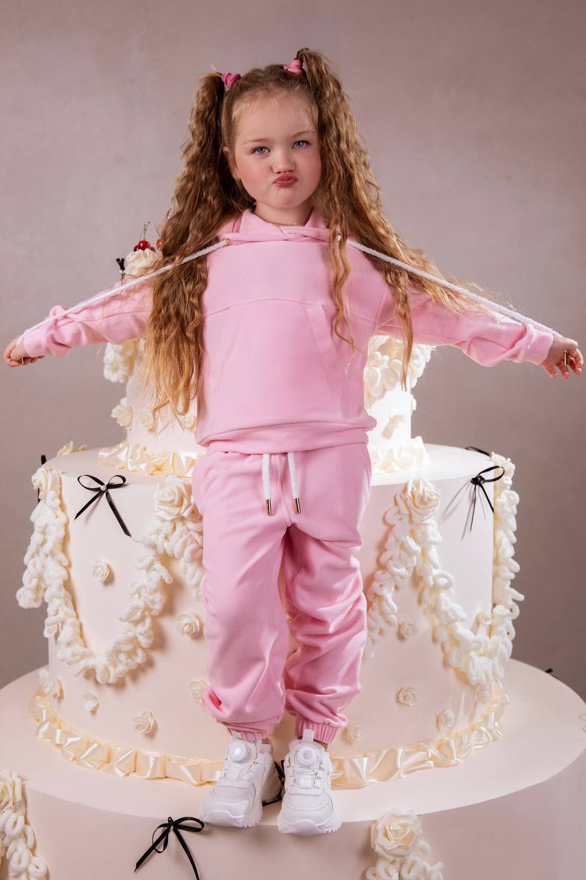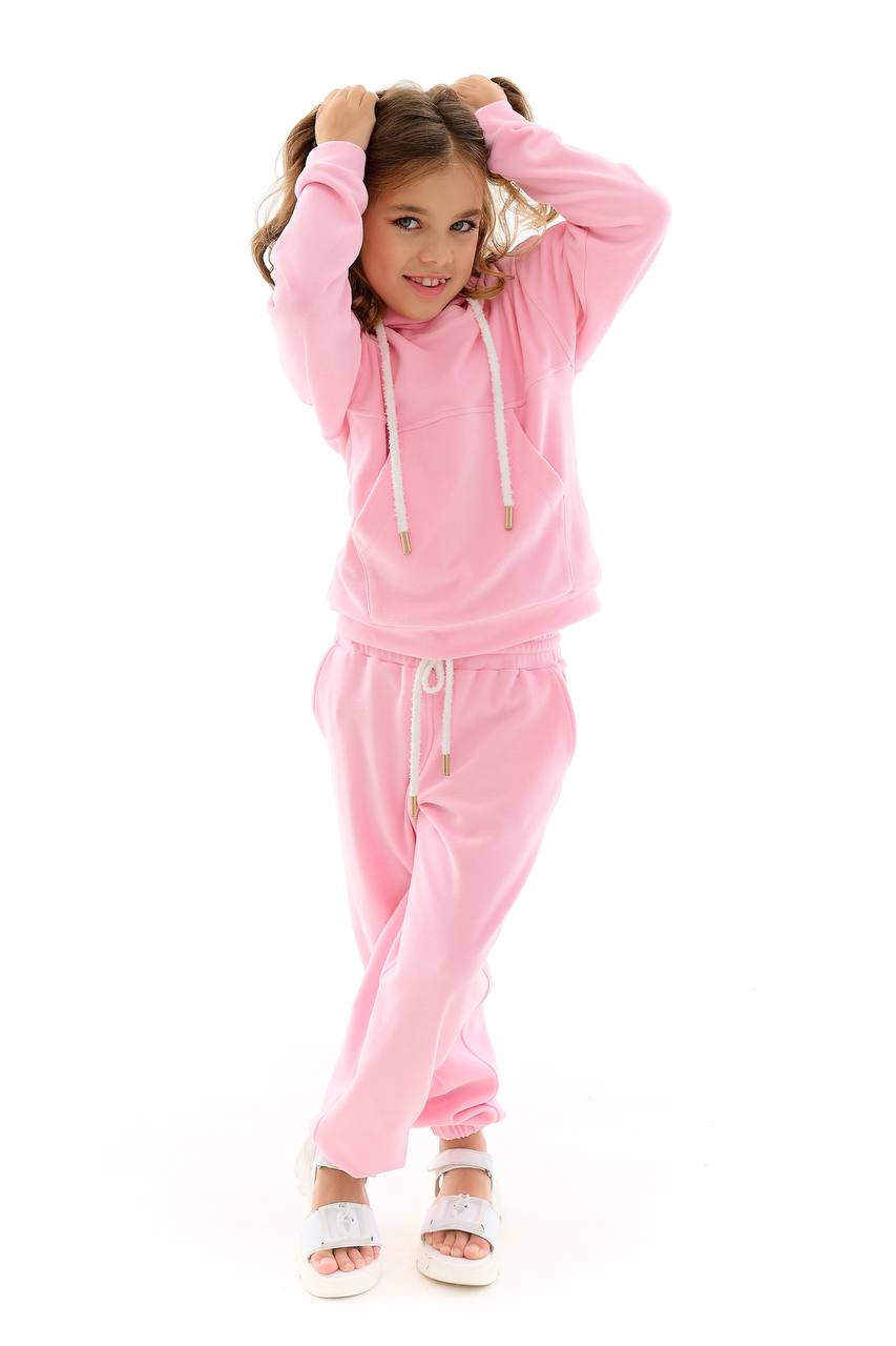 Рожевий костюм — стильний та зручний варіант для активних дівчаток. Ніжний відтінок рожевого додає образу легкості та яскравості, а продуманий крій забезпечує максимальний комфорт під час руху. Ідеальний для прогулянок, садочка, подорожей та повсякденного носіння.
