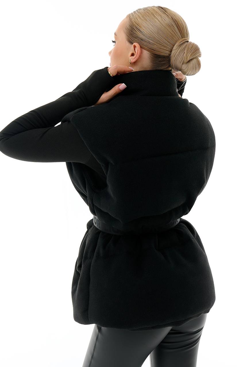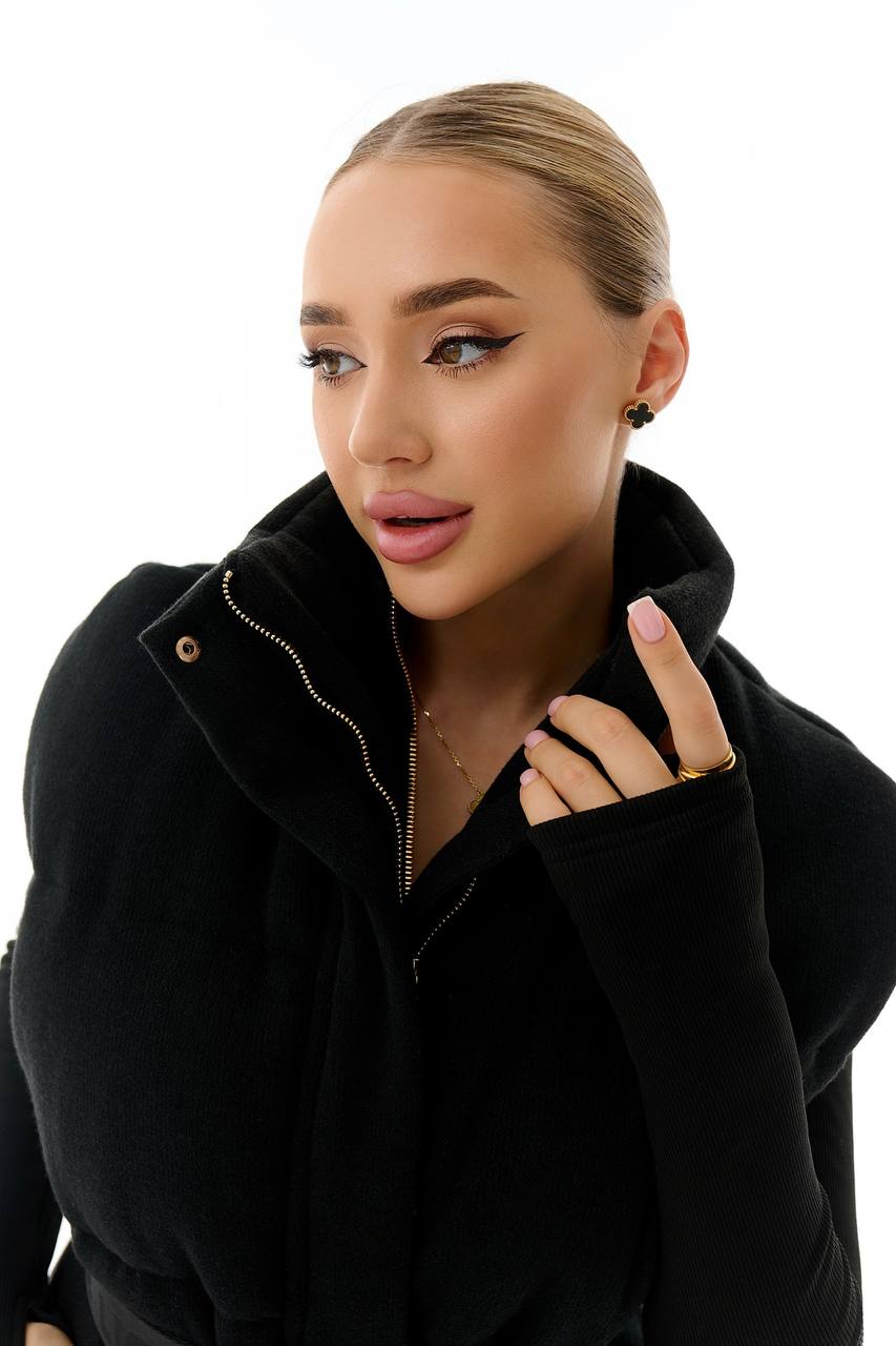 Жилетка в чорному кольорі — це стильний та універсальний елемент верхнього одягу, який ідеально доповнить базовий гардероб. Лаконічний дизайн створює жіночний силует, а глибокий чорний колір додає образу елегантності та строгості.