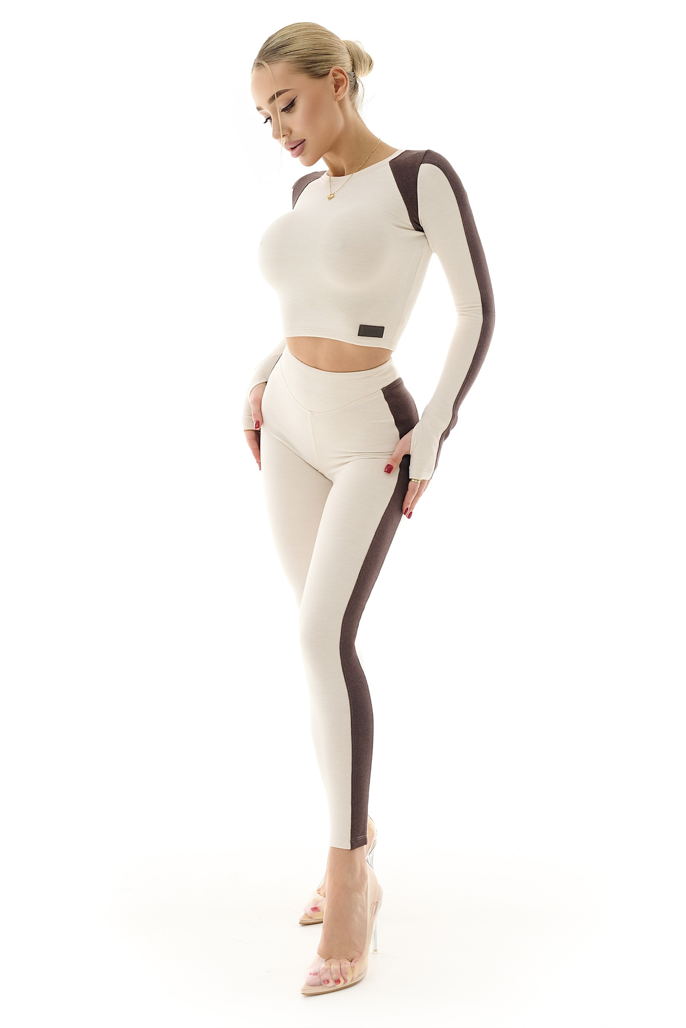 Топ BURLESQUE MRIYA бежевий зі вставками шоколадного відтінку поєднує витонченість та практичність. Контрастні лінії на тканині візуально коригують фігуру, підкреслюючи талію та лінію грудей. Кроп-топ з довгими рукавами та круглим вирізом добре сідає по фігурі, а отвори для великого пальця додають сучасності та зручності. Еластичний матеріал забезпечує свободу рухів і комфорт під час тренувань або активного дозвілля.