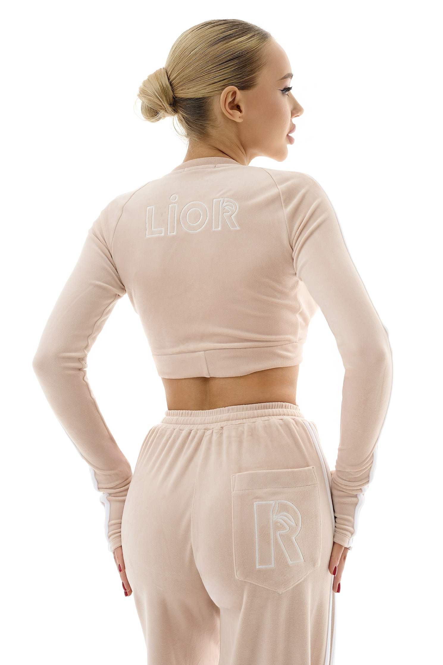 Жіночий топ виконаний із м’якого велюру, який приємний до тіла та має елегантну фактуру. Модель має глибокий V-подібний виріз, що красиво підкреслює силует і додає образу виразності. Довгі рукави та контрастні лампаси створюють стильний спортивно-елегантний акцент.