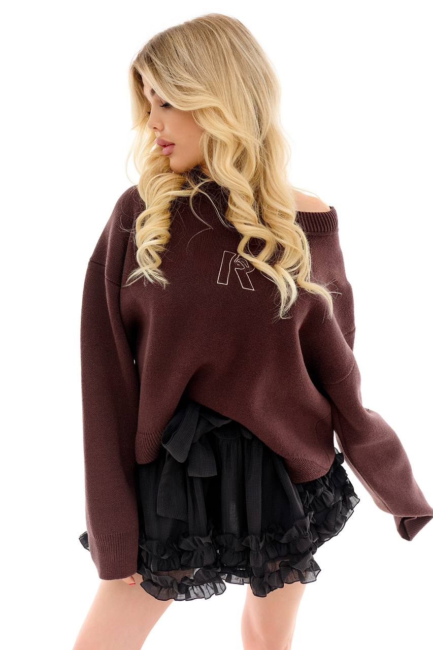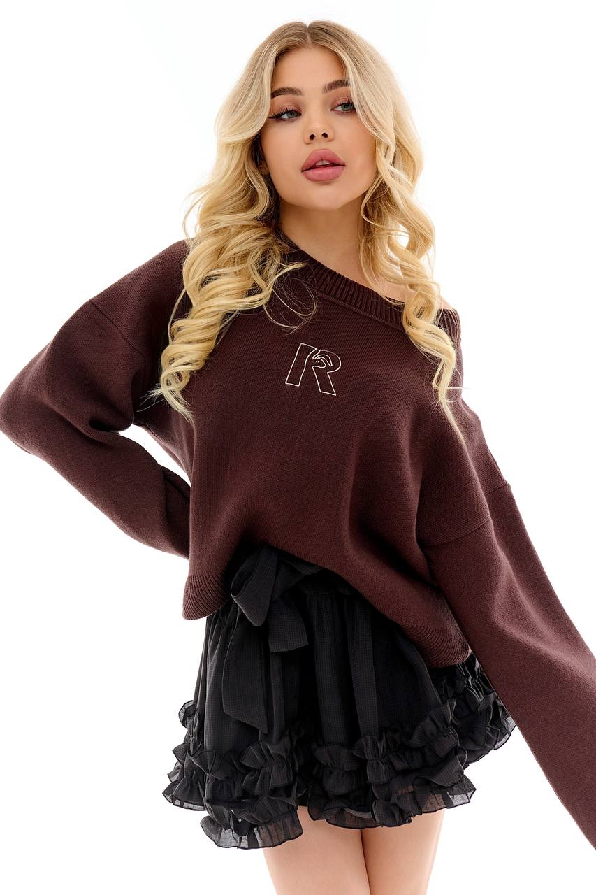 Стильный oversize свитер в глубоком шоколадном оттенке с контрастным бежевым логотипом создает эффектный и современный образ. Модель выглядит дорого и трендово, легко сочетается как с базовыми вещами, так и с акцентными элементами гардероба.