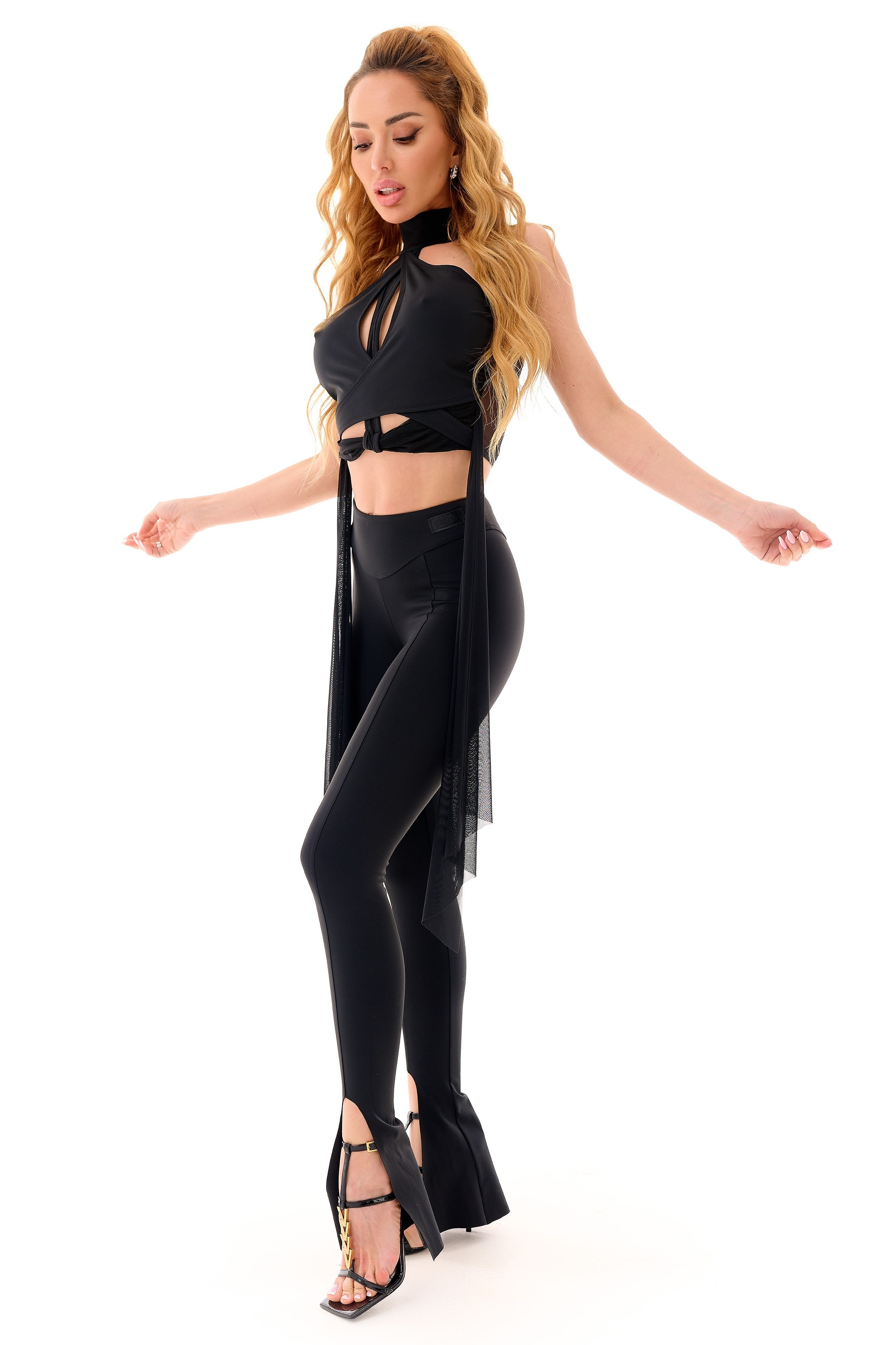 Благодаря использованию плотного, но эластичного трикотажа, майка обеспечивает идеальную посадку и комфорт. Она легко трансформируется из повседневного элемента в вечерний акцент, добавляя образу нотки интеллектуального стиля. Это идеальное решение для тех, кто ищет безупречный черный топ с выразительной дизайнерской деталью.