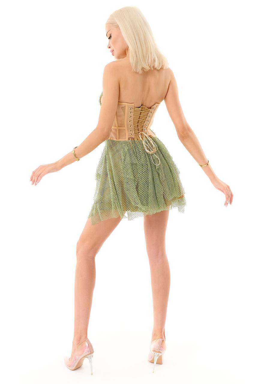 Корсетна сукня-сітка — легка та спокуслива, створена, щоб притягувати погляди. Корсетний крій підкреслює талію, а напівпрозора сітка додає образу чуттєвості. Ідеальний вибір для особливих моментів.