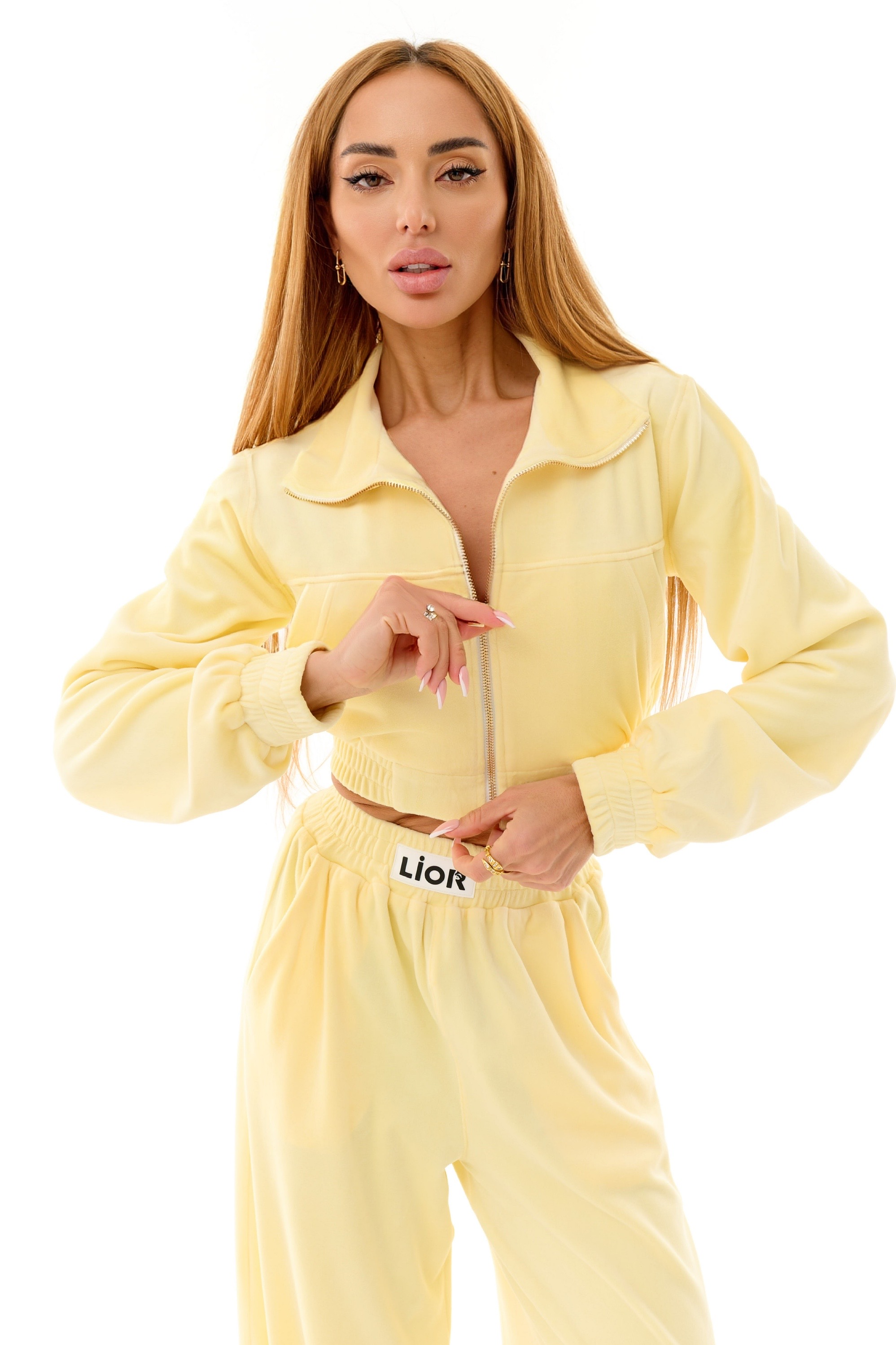 Велюрова куртка LIOR PARIS — стильний акцент у твоєму гардеробі. М’який велюр приємний до тіла та виглядає дорого, а укорочений крій підкреслює талію та робить фігуру візуально стрункішою. Фірмовий логотип LIOR на спинці додає образу характеру. Ідеальна для міських образів, подорожей і комфортних прогулянок.