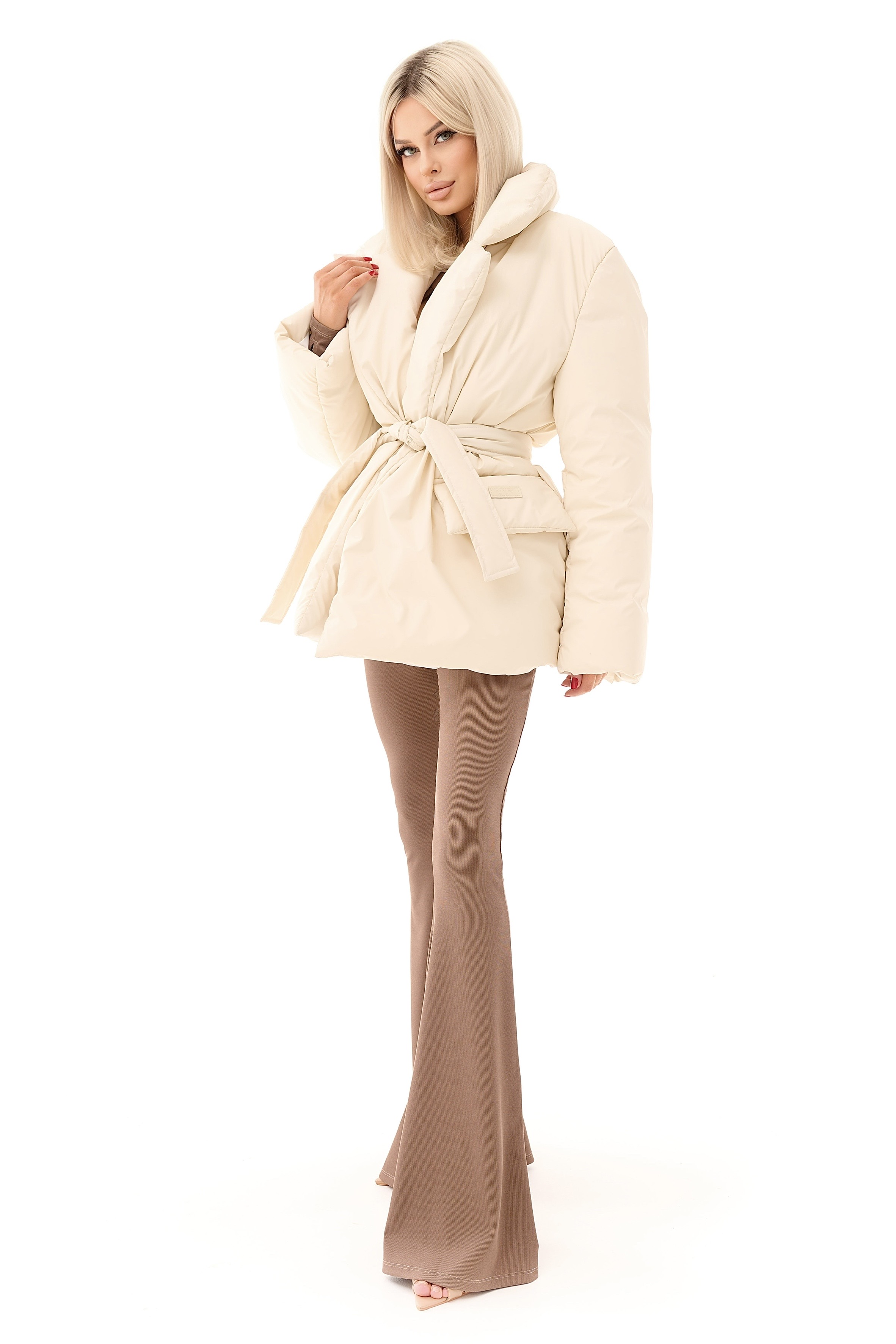 Елегантний пуховик у ніжному молочному відтінку — стильне рішення для холодної пори року. Модель поєднує тепло та витончений силует завдяки широкому поясу, який красиво підкреслює талію та формує жіночний образ.