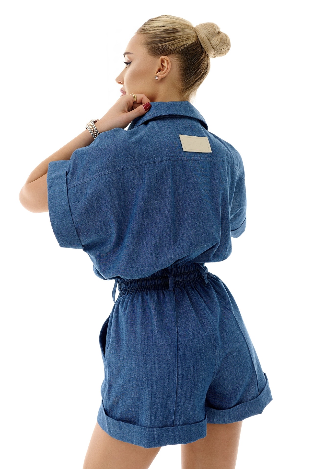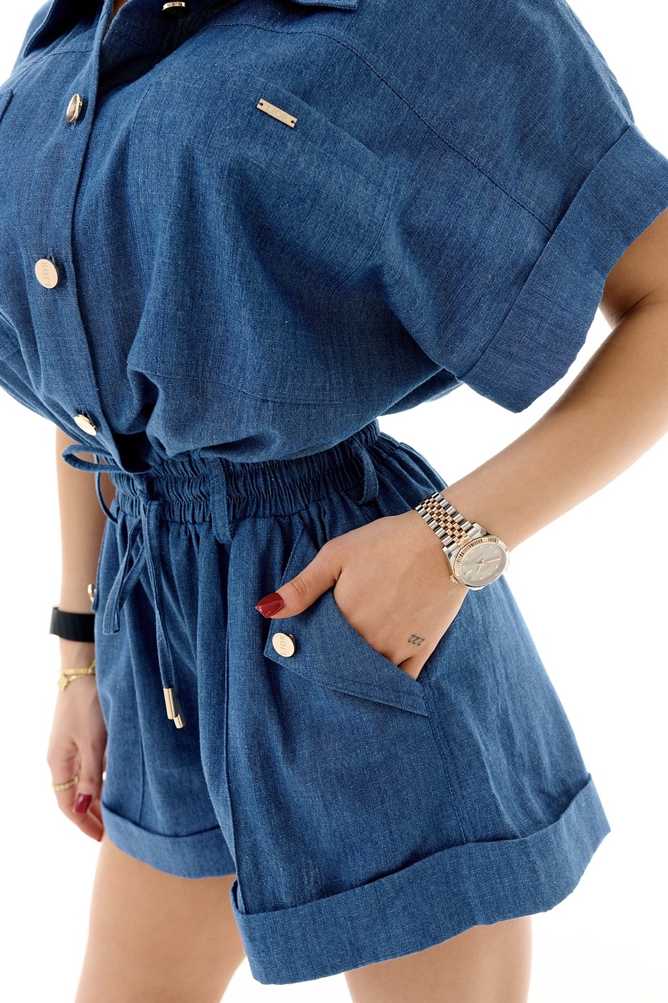 Виготовлений з високоякісної натуральної тканини (льон або бавовна), комбінезон забезпечує відчуття прохолоди навіть у найспекотніші дні, дозволяючи шкірі дихати. Еластичний пояс на резинці витончено підкреслює талію, створюючи жіночний силует, а вільний крій шортів гарантує повний комфорт у русі. Це універсальний елемент, який гармонійно поєднується з білими кросівками для розслаблених прогулянок, або з босоніжками на підборах для більш святкових вечірніх виходів.