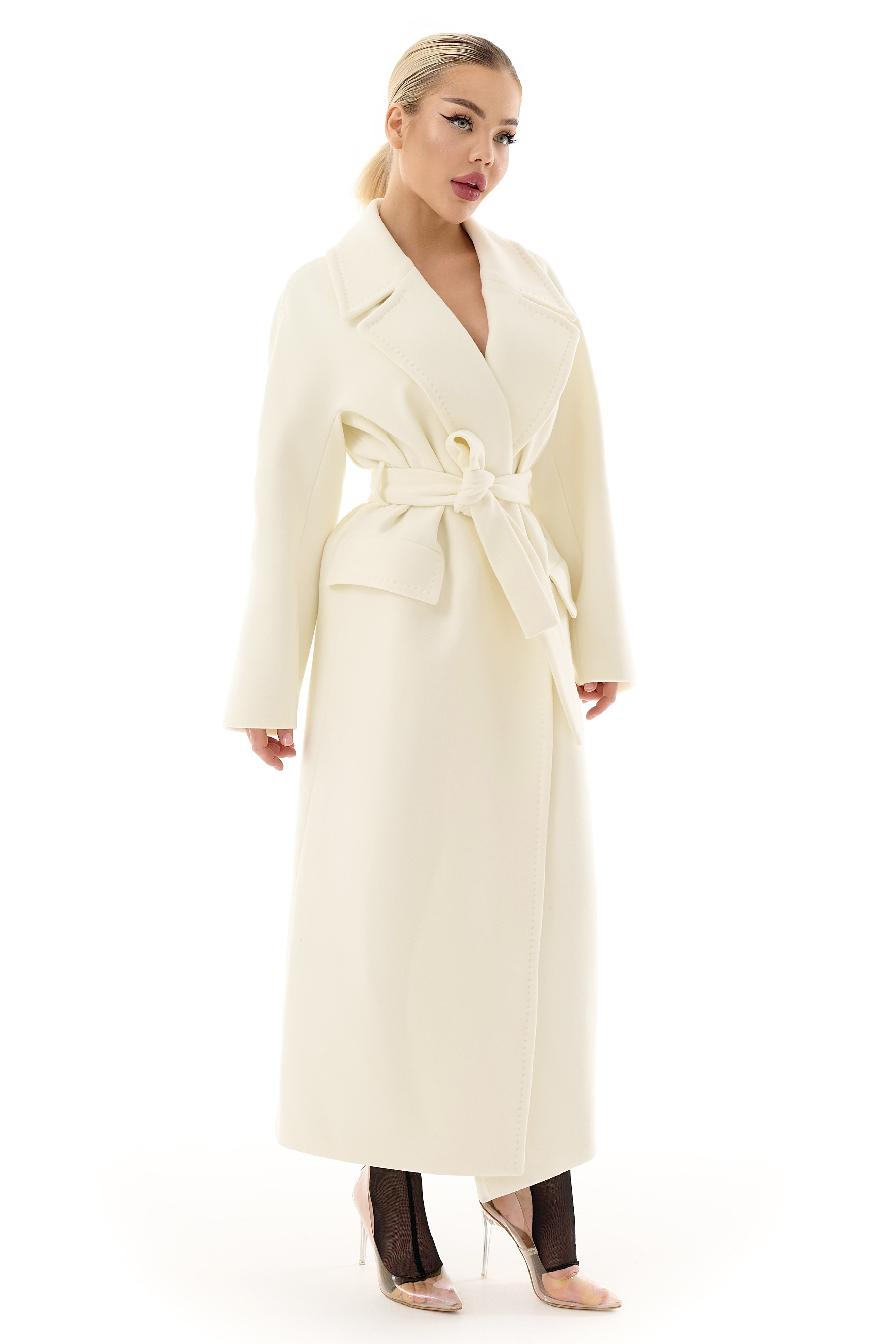 Элегантное длинное пальто в благородном молочном оттенке – изысканная база для стильных осенне-весенних образов. Прямой крой в сочетании с поясом подчеркивает талию и формирует женственный, утонченный силуэт.