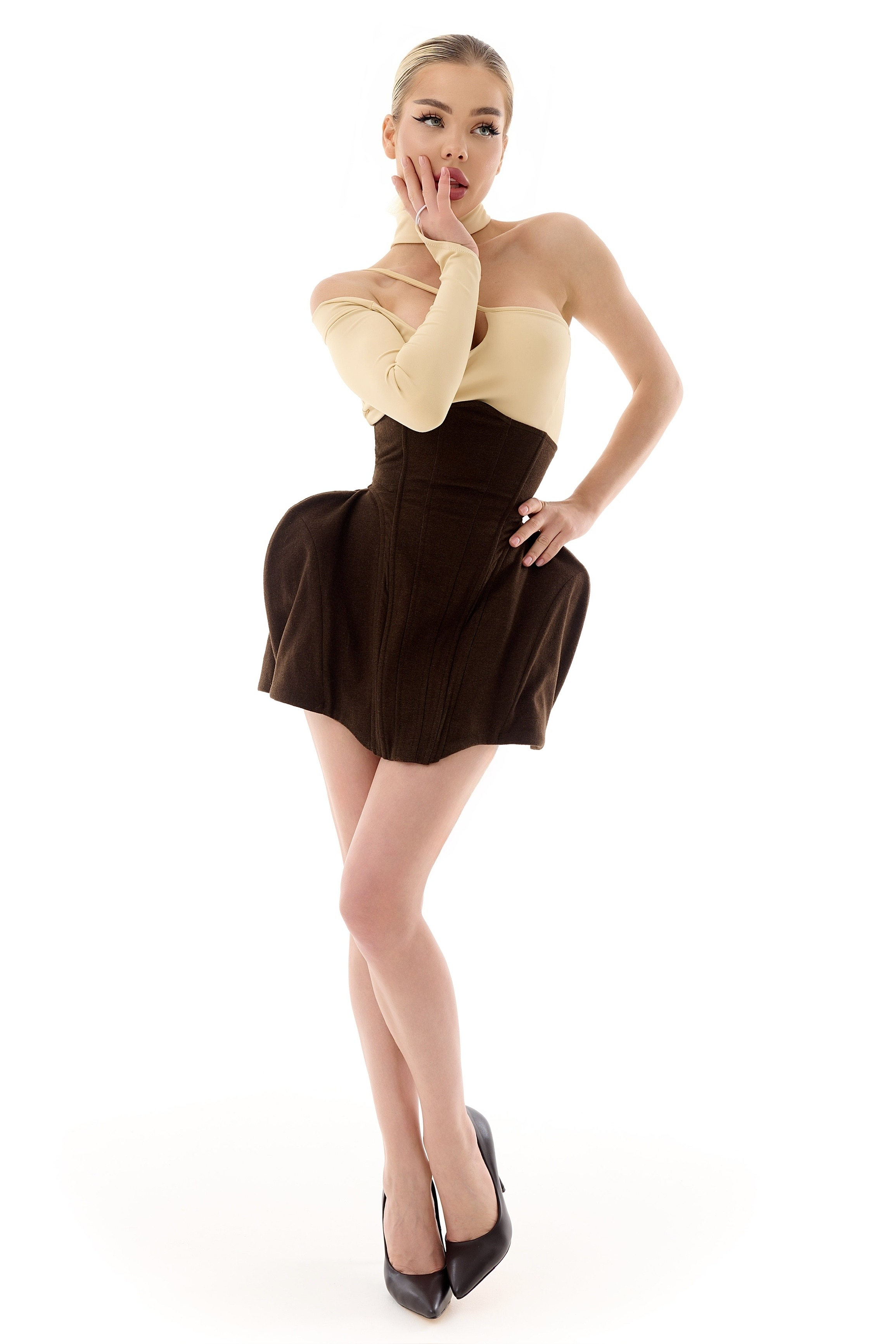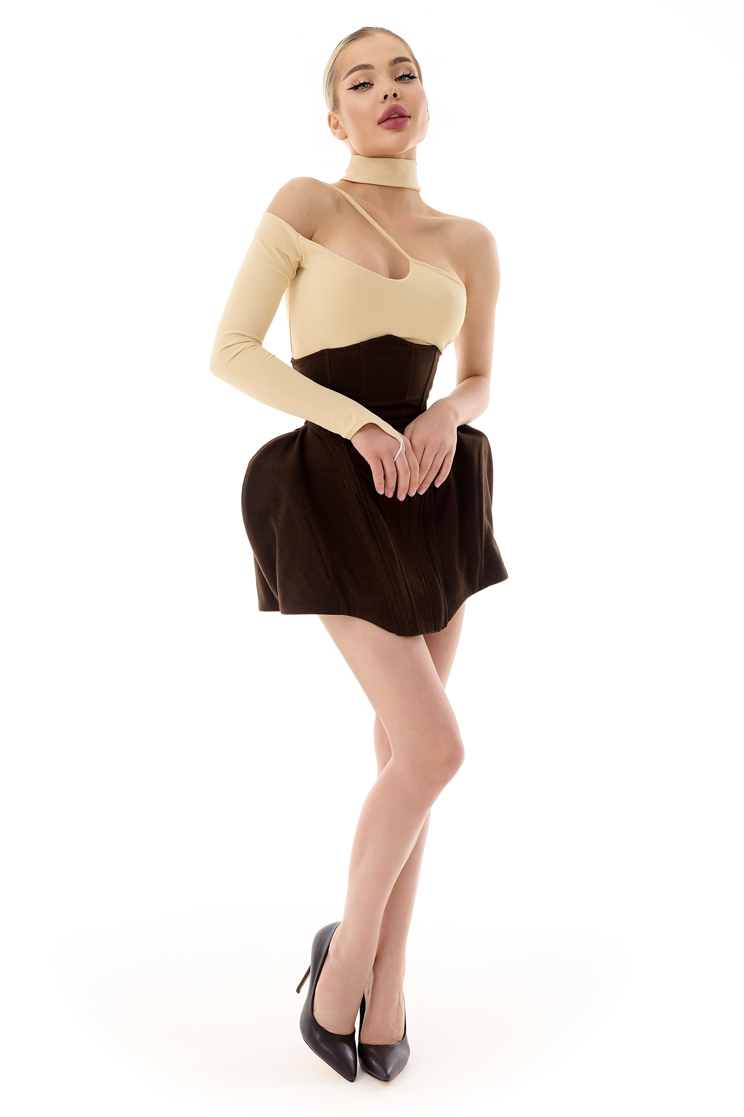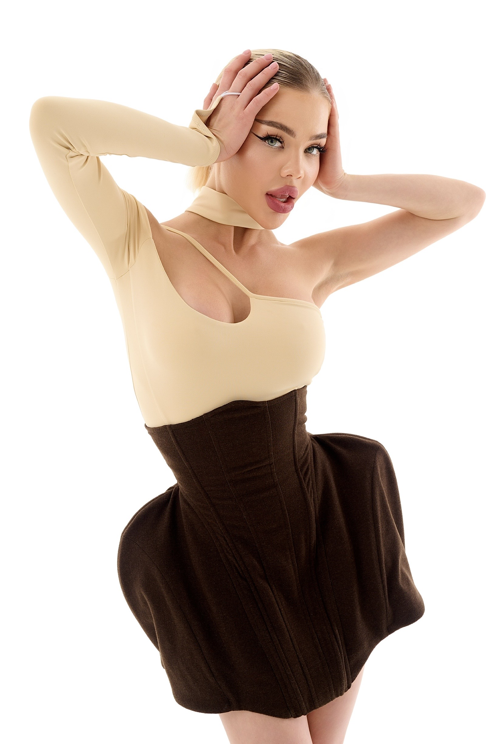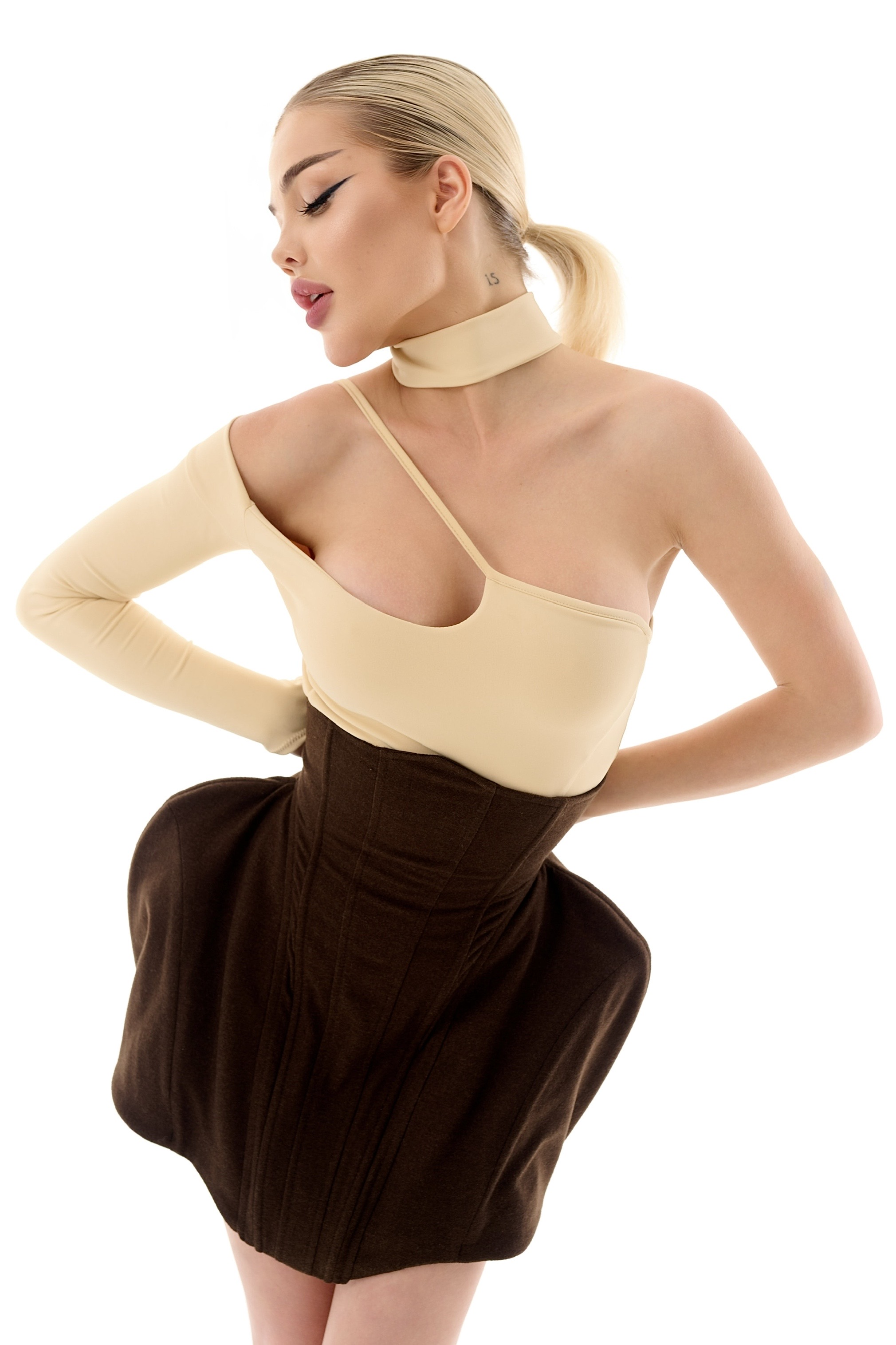 Ассиметричный верх с открытым плечом и акцентным чокером создает выразительный силуэт и привлекает внимание. Облегающий крой подчеркивает талию и линию бедер, зрительно вытягивает фигуру и формирует женственный силуэт. Эластичная ткань мягко прилегает к телу, обеспечивая комфорт и свободу движений.