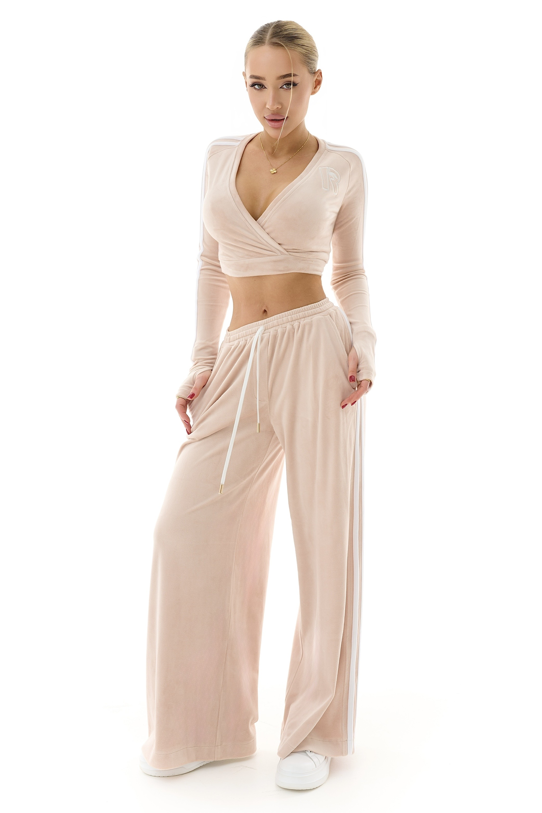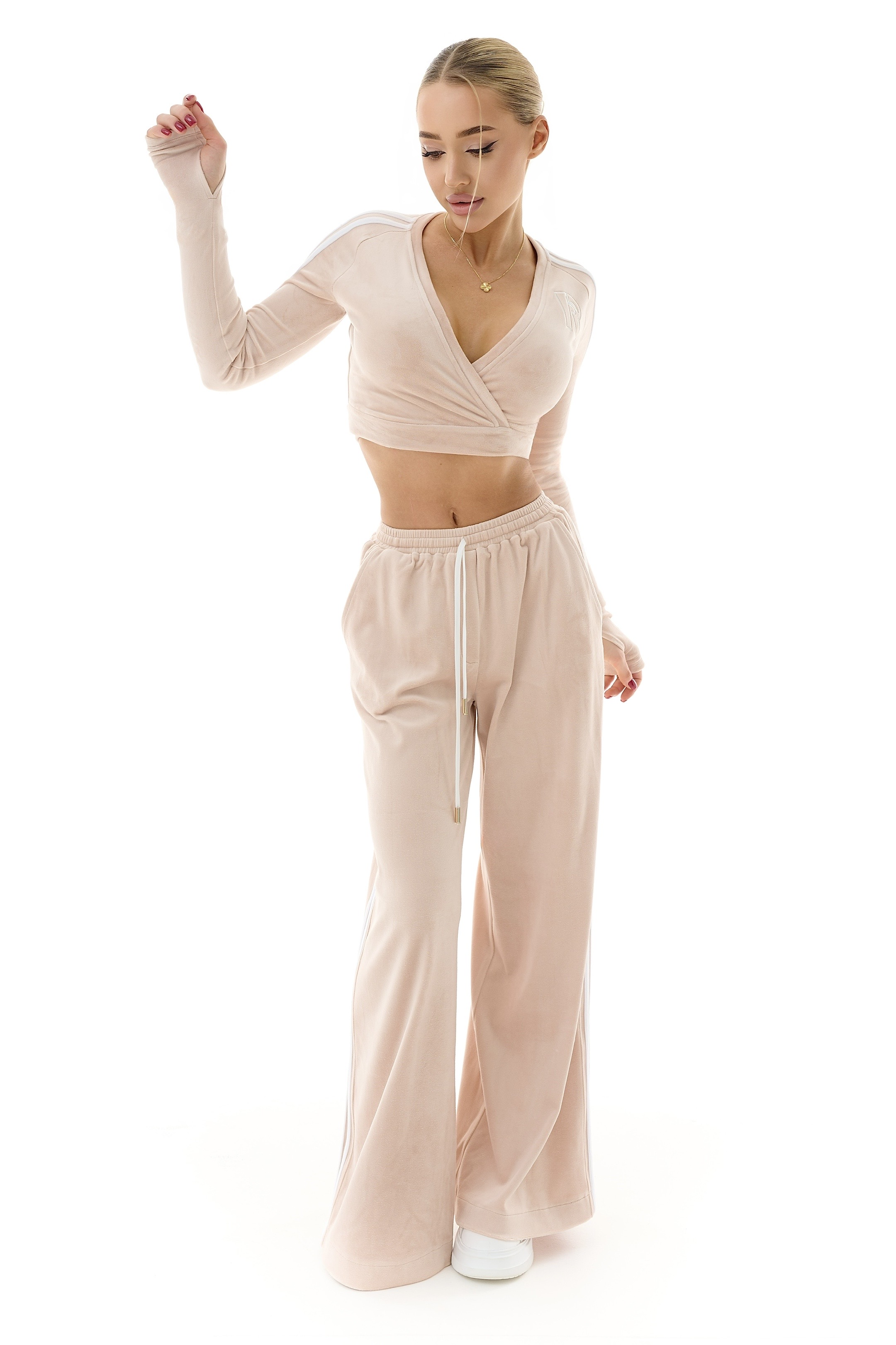 Женские штаны выполнены из мягкого велюра, который приятен к телу и элегантный матовый блеск. Модель имеет свободный крой с широкими штанинами, что создает изящный силуэт и обеспечивает комфорт во время движения. Пояс на резинке с декоративным шнурком позволяет легко регулировать посадку.